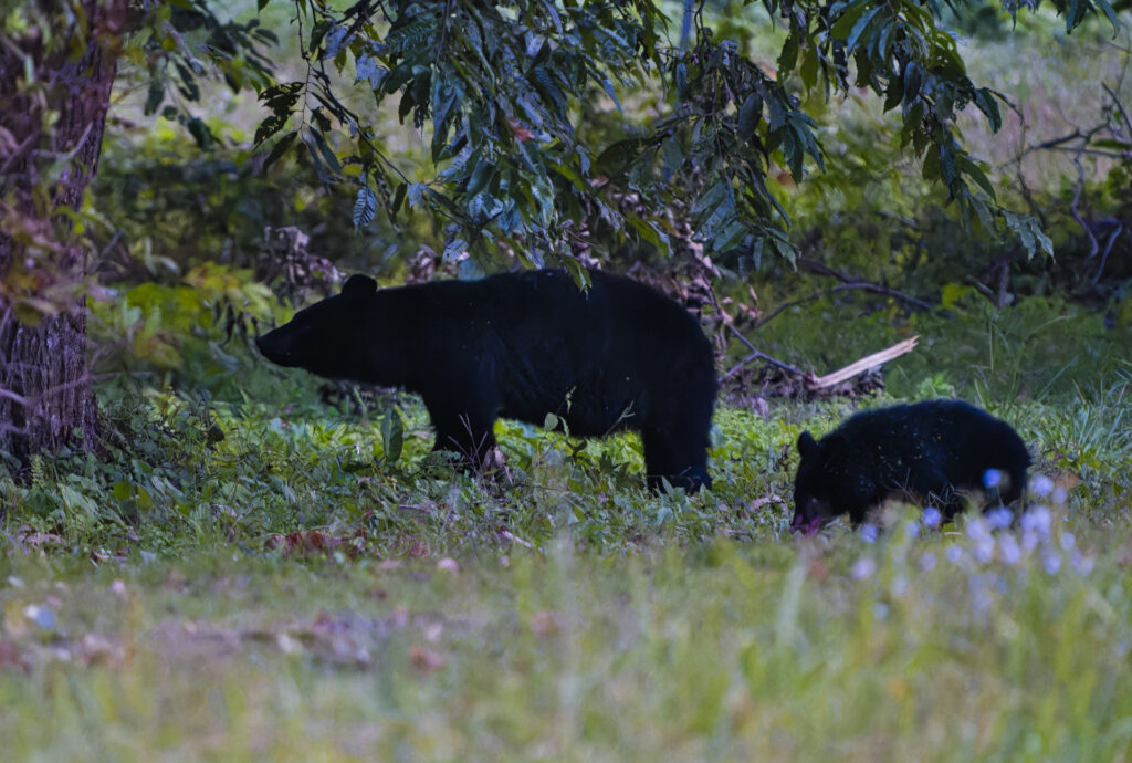 早朝にヤマセミ狙いで川の中流・上流域まで車を走らせていると、薄暗くわかりにくいですが、ツキノワグマの親子が佇んでいました。