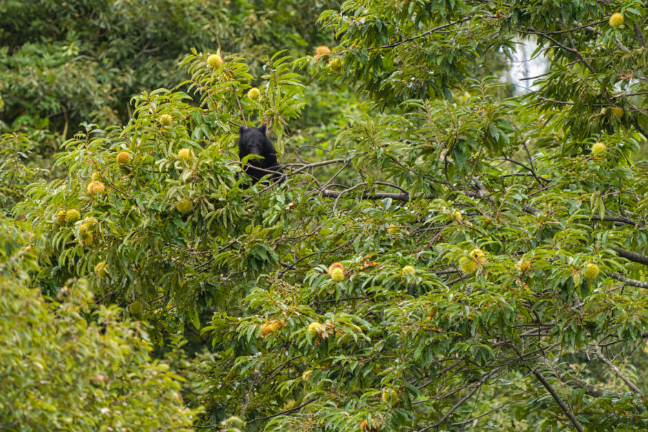こちらも廃村となった場所の近くに生えた栗の木にツキノワグマの親子が来ていました。