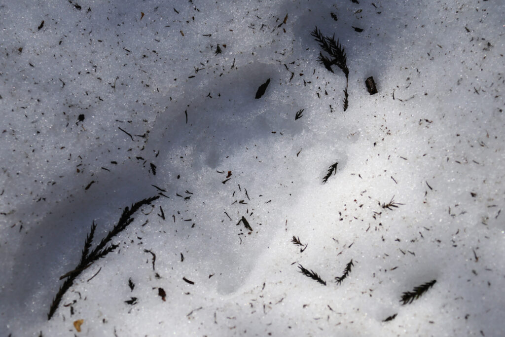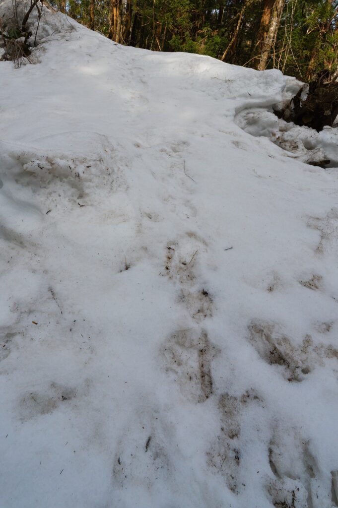 春先に渓流と並行する小道を進んで、雪解け具合を確かめていたところ、雪上に残るクマらしき足跡を見つけました。まだ3月20日だというのに、どうやらクマは冬眠から目覚め活動しているようです。