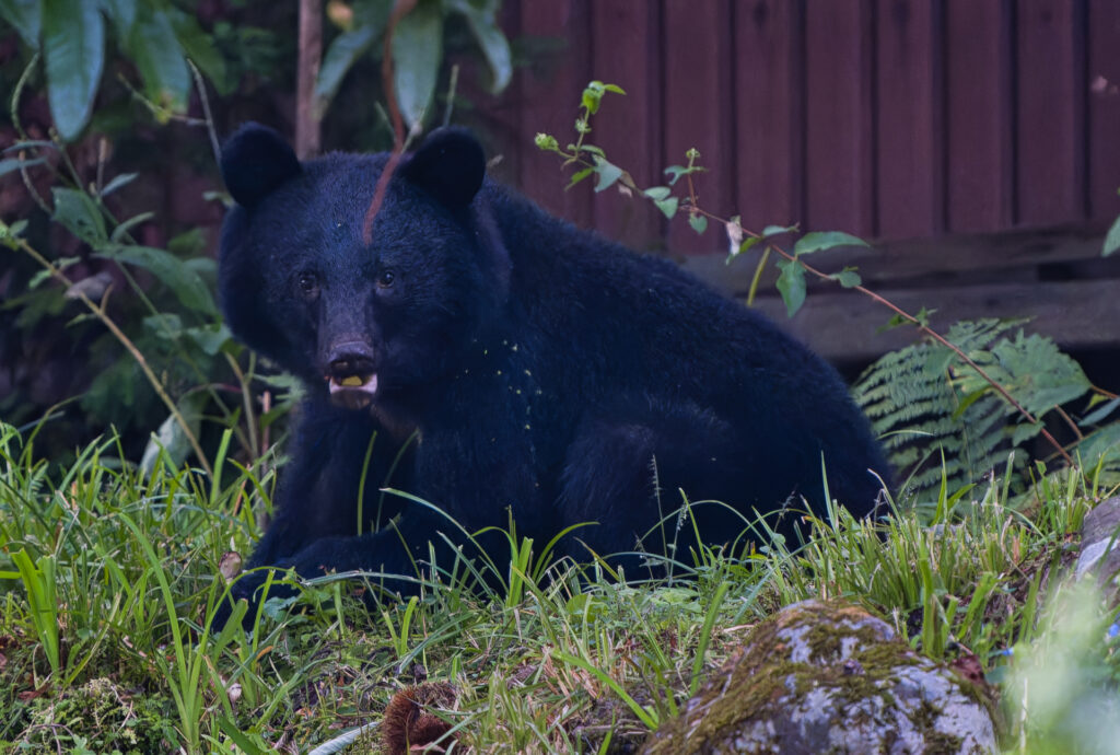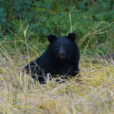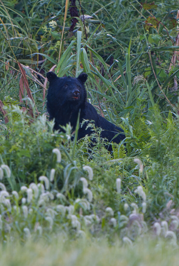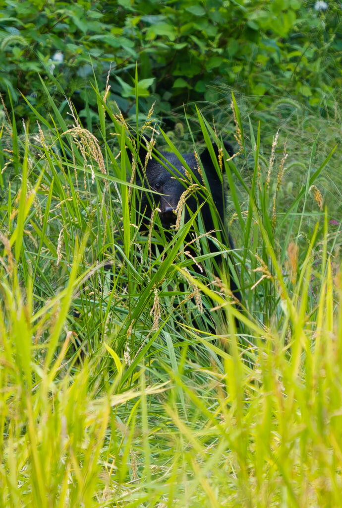 草むらからヌッとクマが起き上がりました。このような草むらで寝るのか、2023年にも茂みにクマの寝た痕跡を見つけたことがあります。こんな場所で寝るのかと、今日もまた新しい発見がありました。