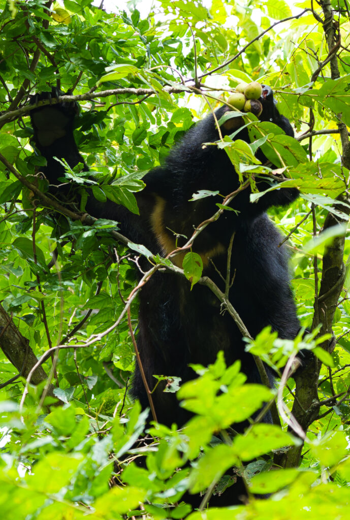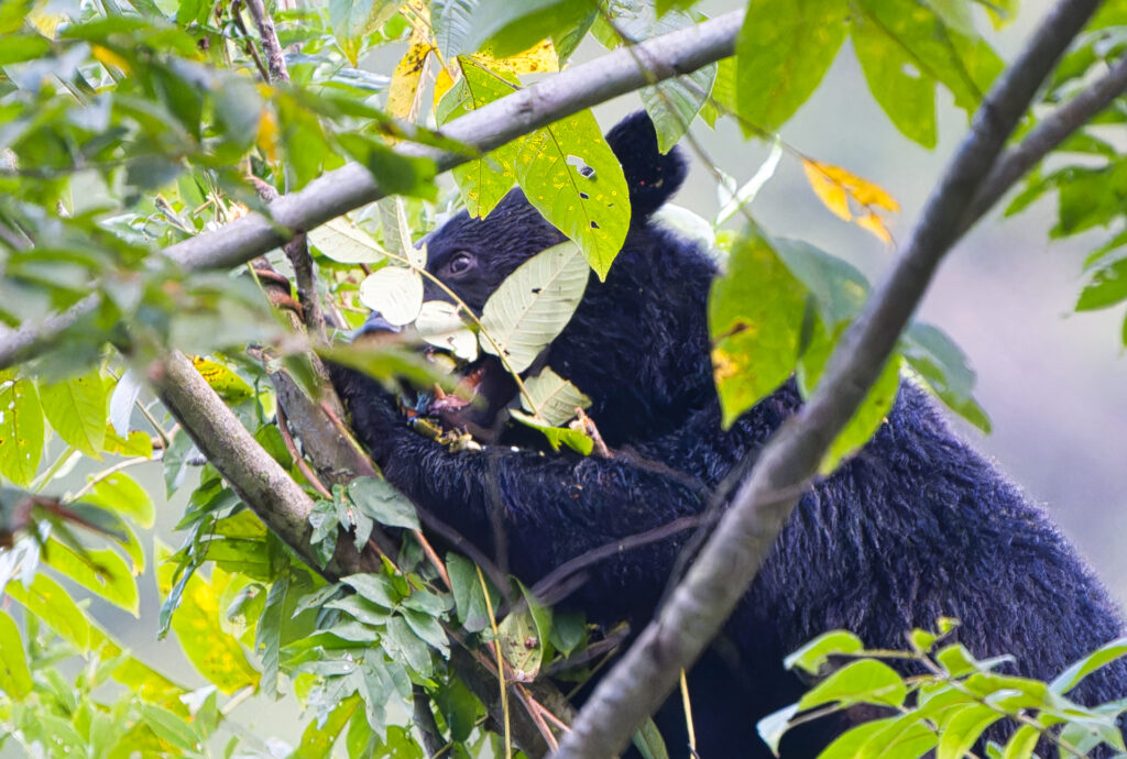 中型のクマが木に登ってクルミの枝を折ったり、実を地面に落としたりしていました。