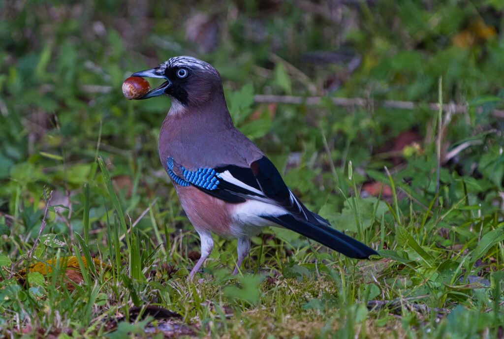 カケスが栗を加えています。初めてみました。地面に落ちた実は他の動物たちによっても貴重な食べ物となるのかな?