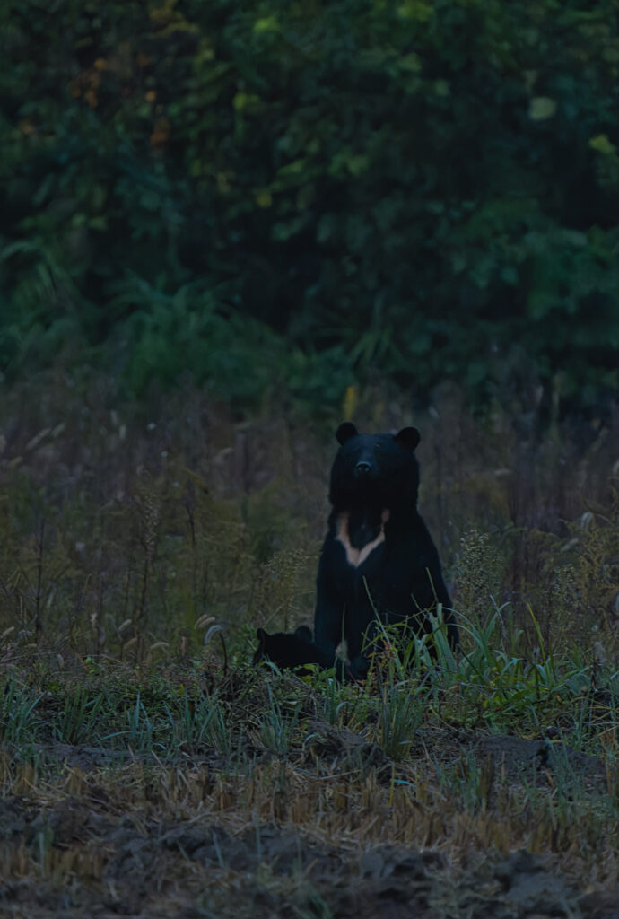 日の出前、田んぼ近くに佇んでいたクマ親子です。私もどんくさいので、クマが立ち上がる瞬間をこれまで捉えられてなかったのですが、今回始めてその姿を撮ることができました。