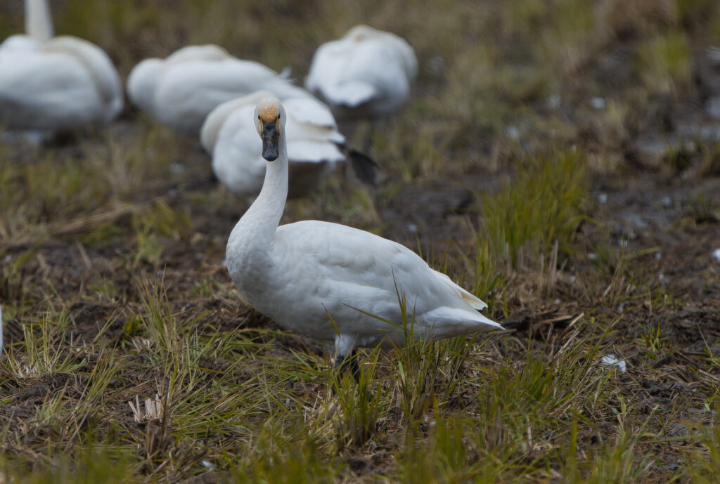 自宅近くの田んぼに群れで滞在していたオオハクチョウです。落穂を食べているようでした。