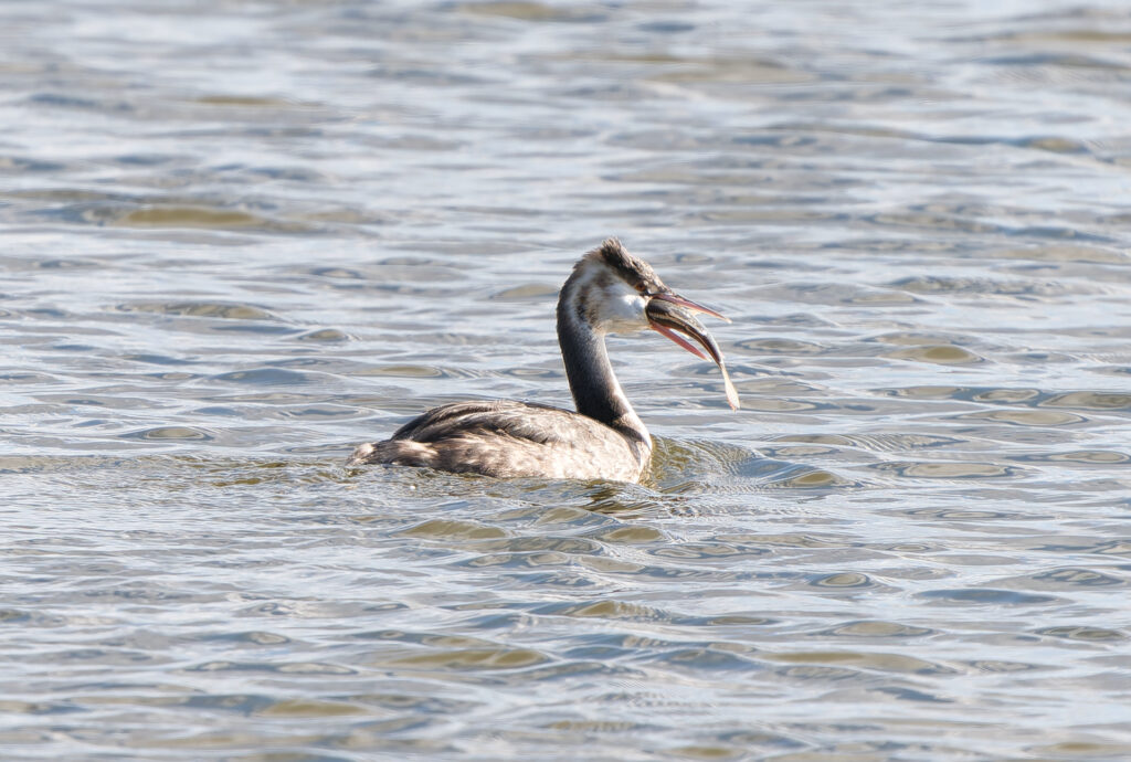 河川ではカンムリカイツブリが大きな魚を丸呑みしています。