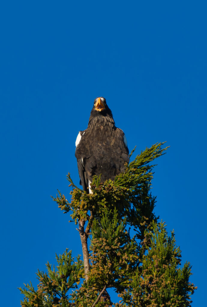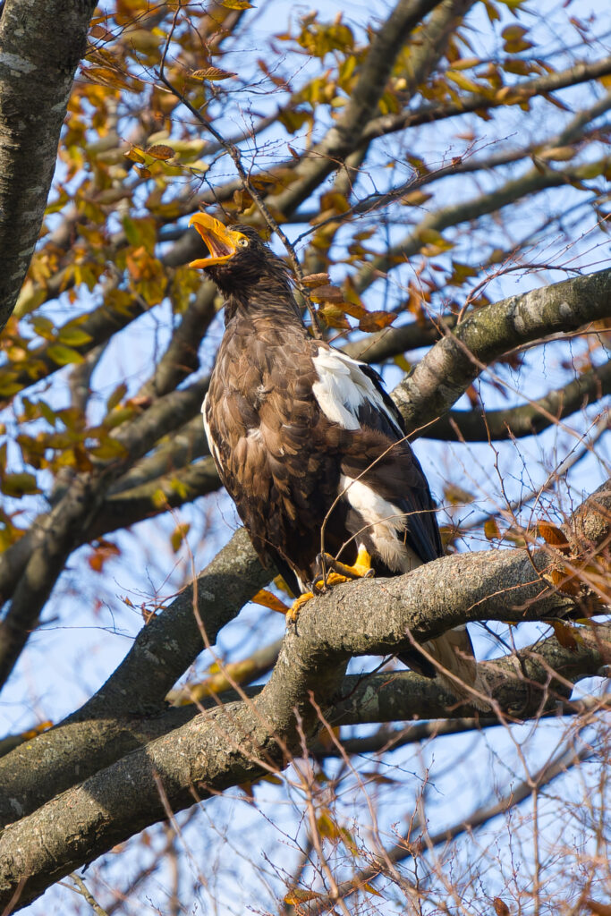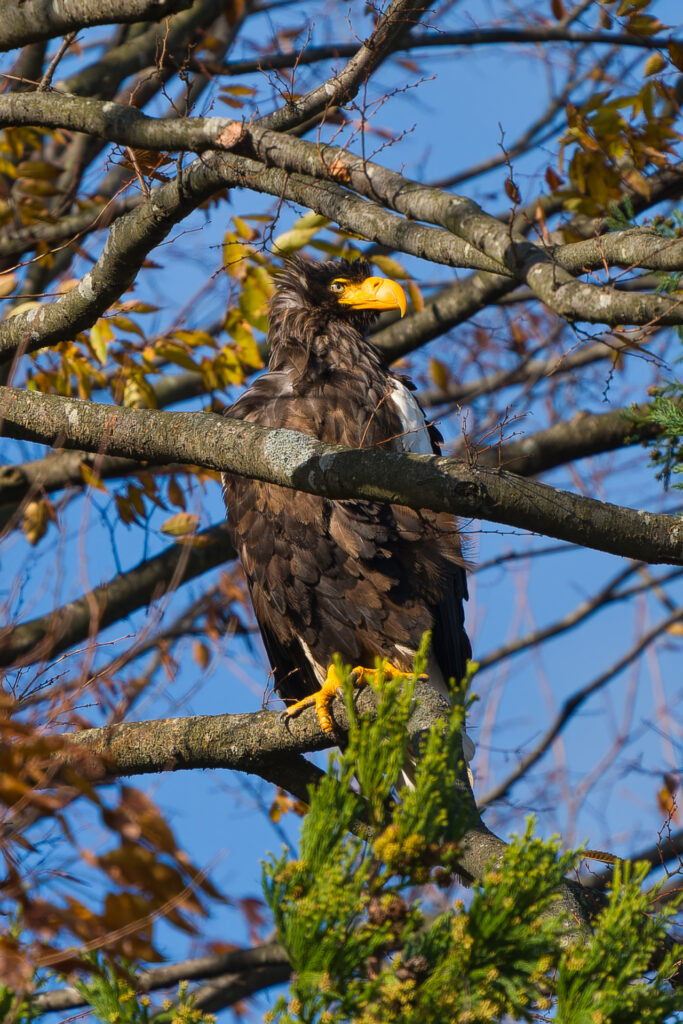 まだ落葉していない広葉樹にオオワシがとまっていました。秋を感じる風景をバックにオオワシを撮ることが、毎年の恒例行事になりつつあります。