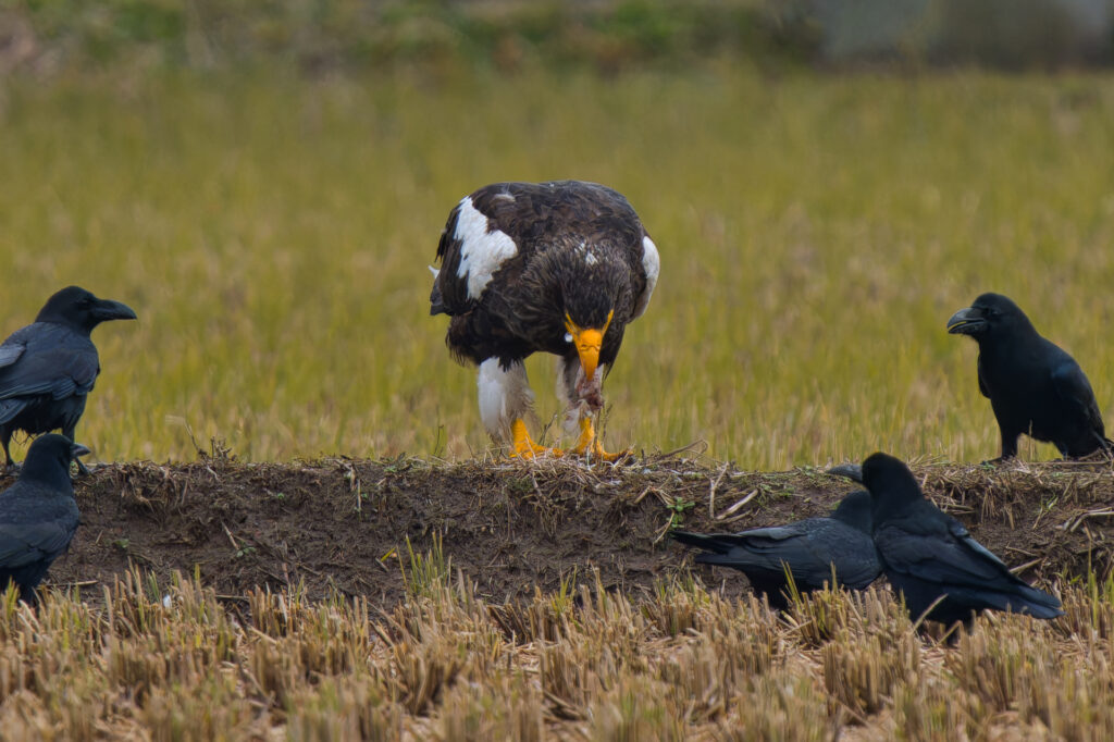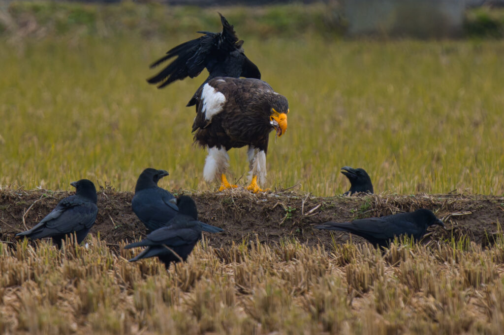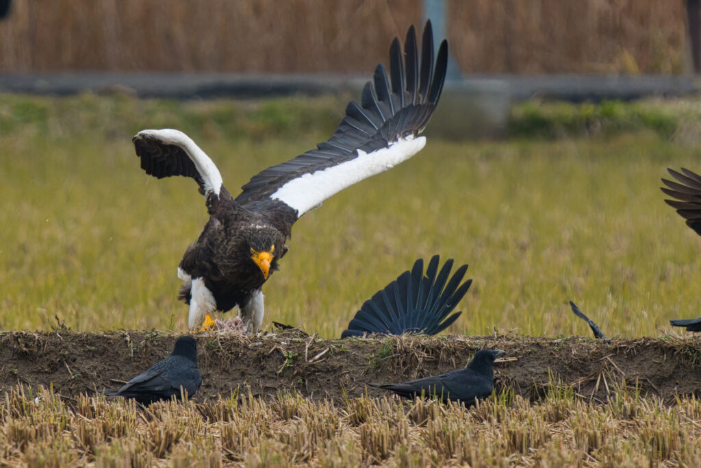 オオワシが魚をハントしたようで、カラスに囲まれながら急ぎお食事していました。