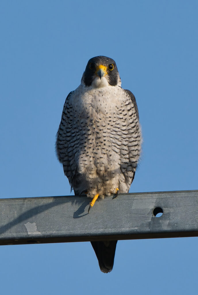 ハヤブサくんは電柱にとまったまま、じっとこちらを見つめていました。