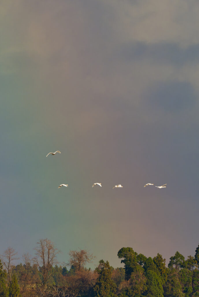 タイミングよくハクチョウたちが虹を背に飛行してくれたので撮影してみました。