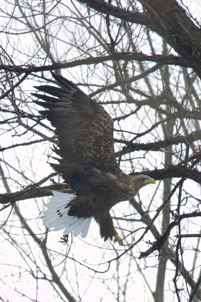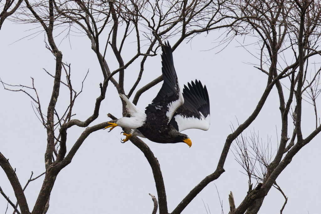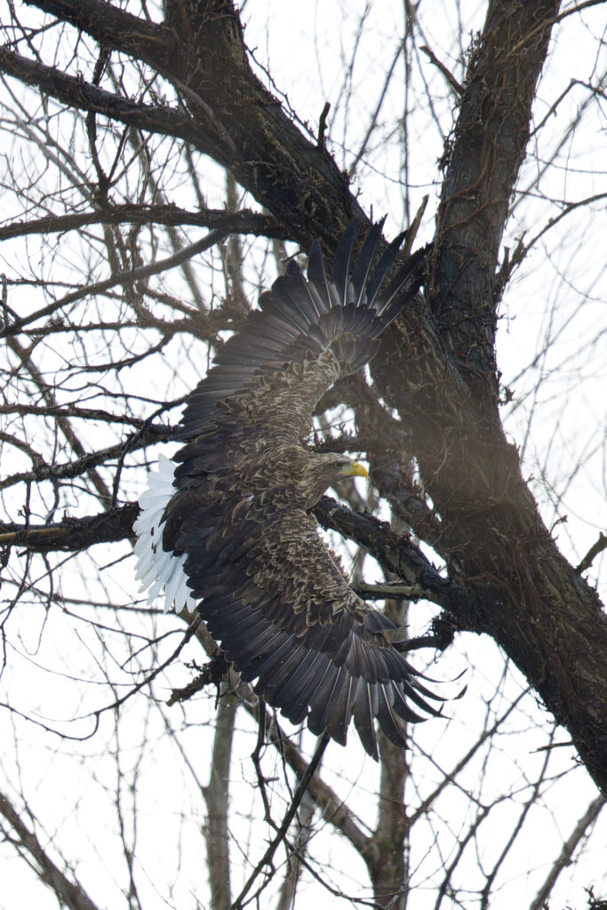 木からオジロワシが飛び出す瞬間です。といっても、木にとまるオジロワシは警戒心が強いので、こちらに気づくとすぐに飛んでしまいました。ラッキーショットですね。