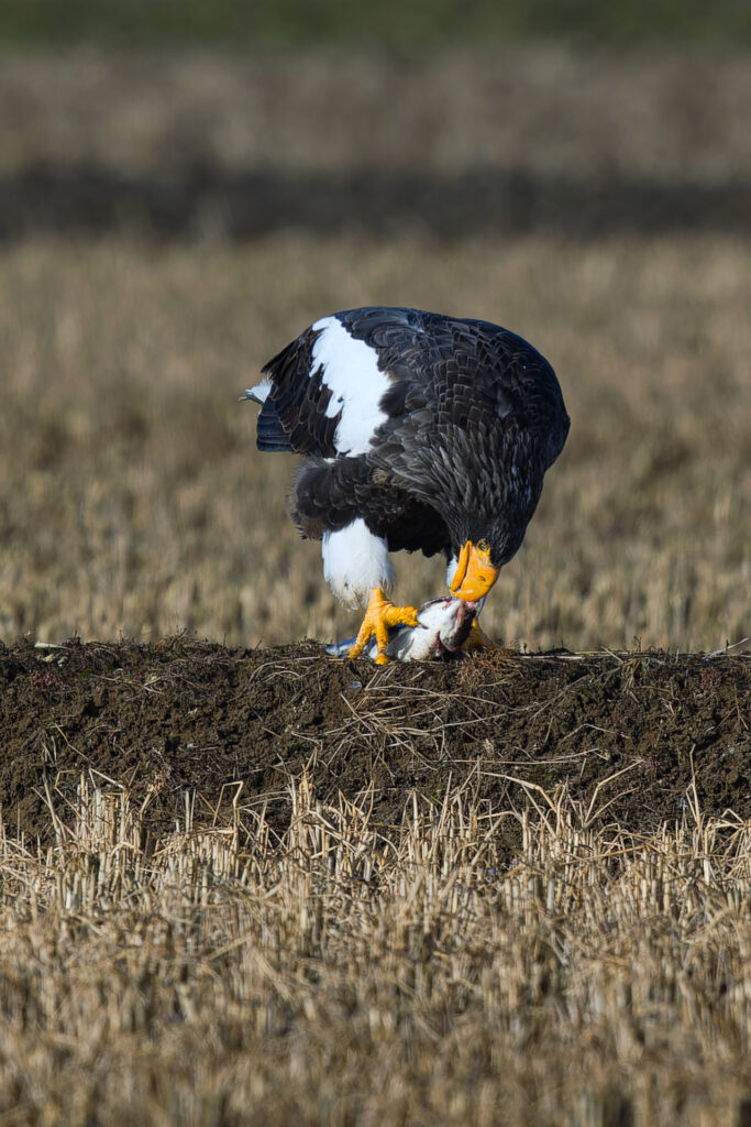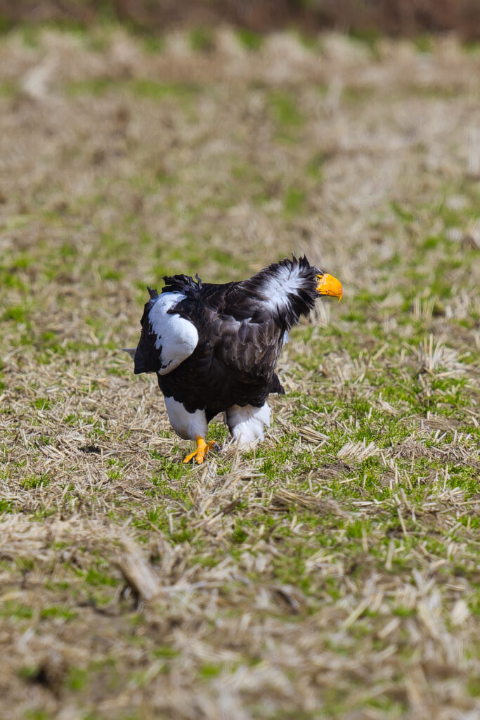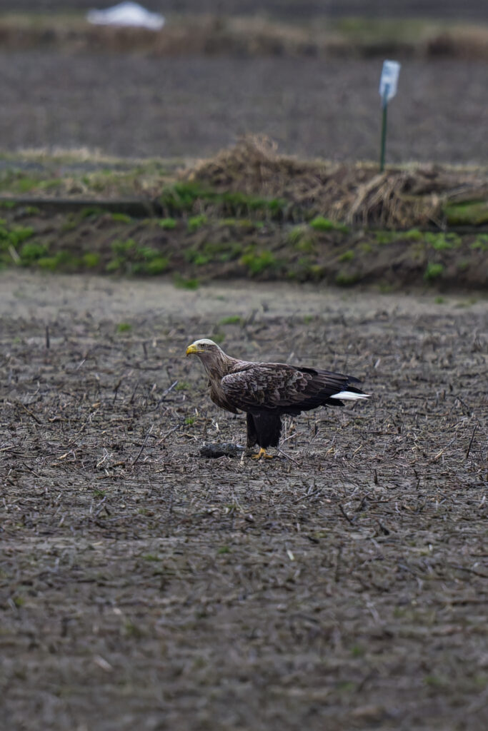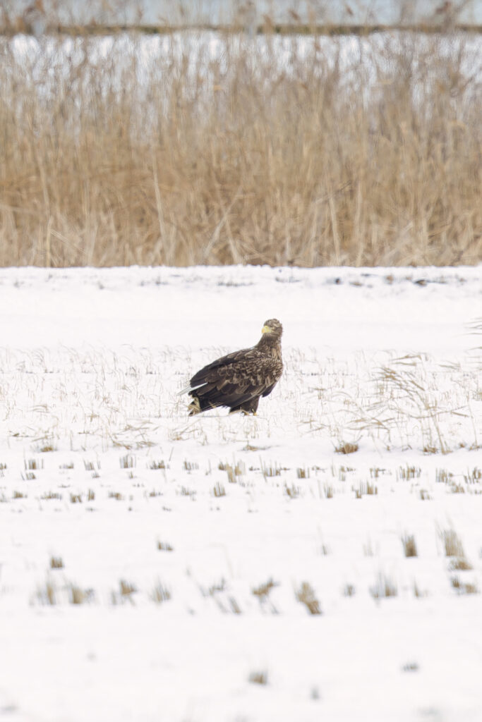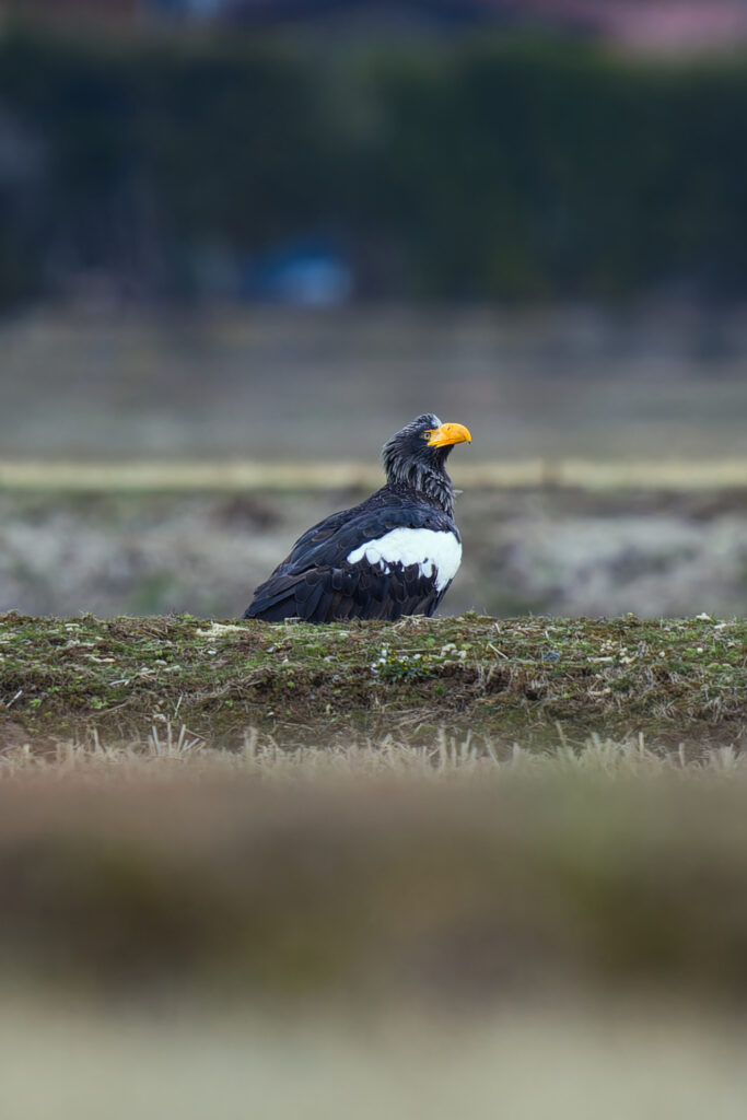 田んぼに佇んでいたオオワシを低めのアングルから撮影しました。