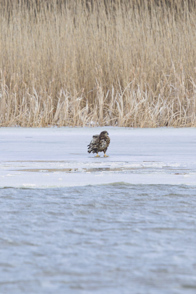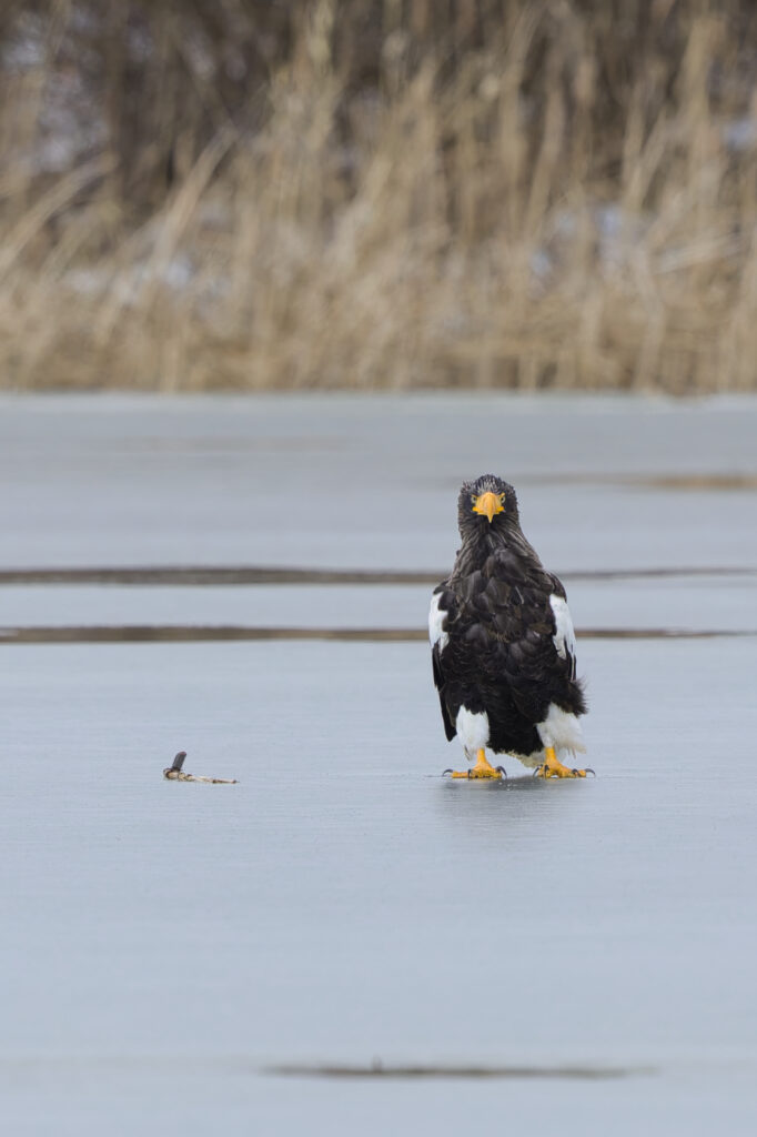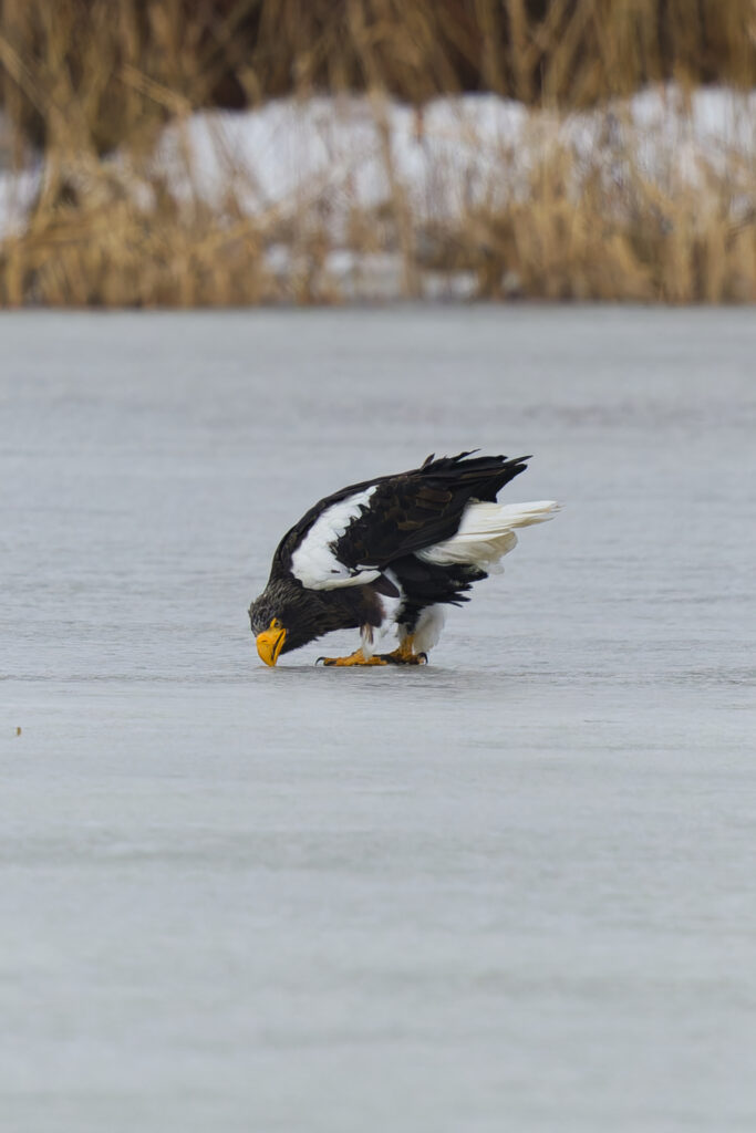 積雪が落ち着いた別日、また氷上にオオワシが降り立っていました。