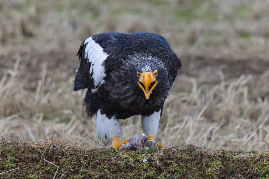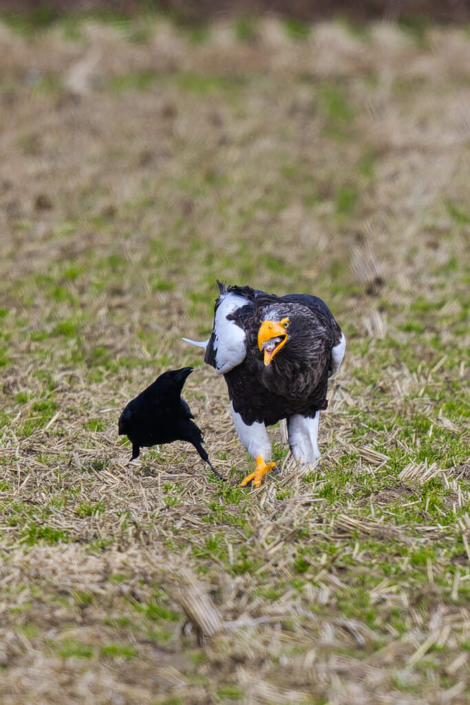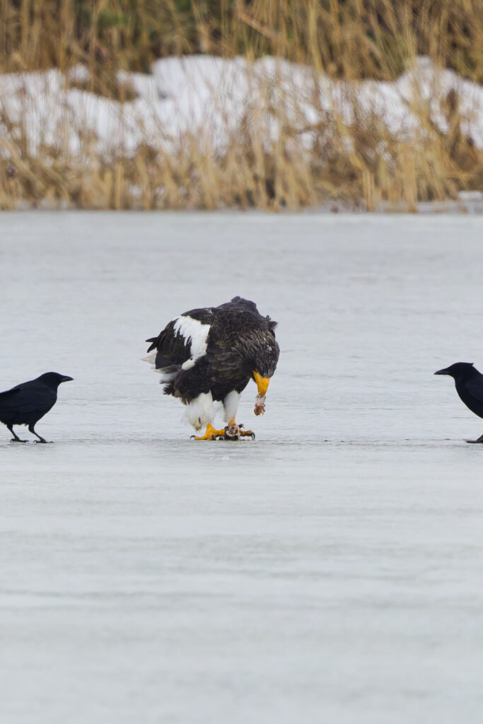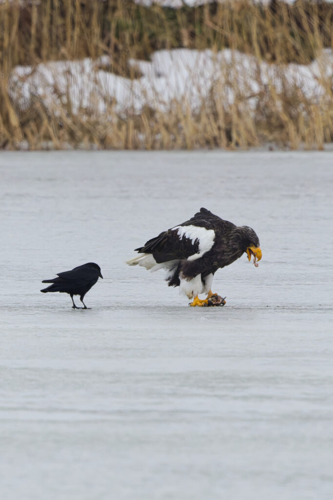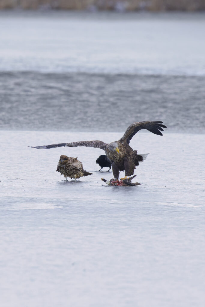 体が小さいオオワシにとって食事も一苦労です。あたりにカラスやトビ、オジロワシがいると、食事もままならないです。