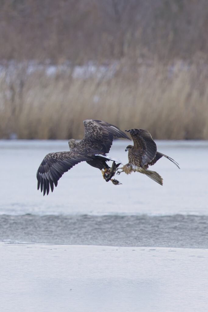 これは魚を食べていたオオワシにオジロワシの亜成鳥がちょっかいをだしているシーンです。