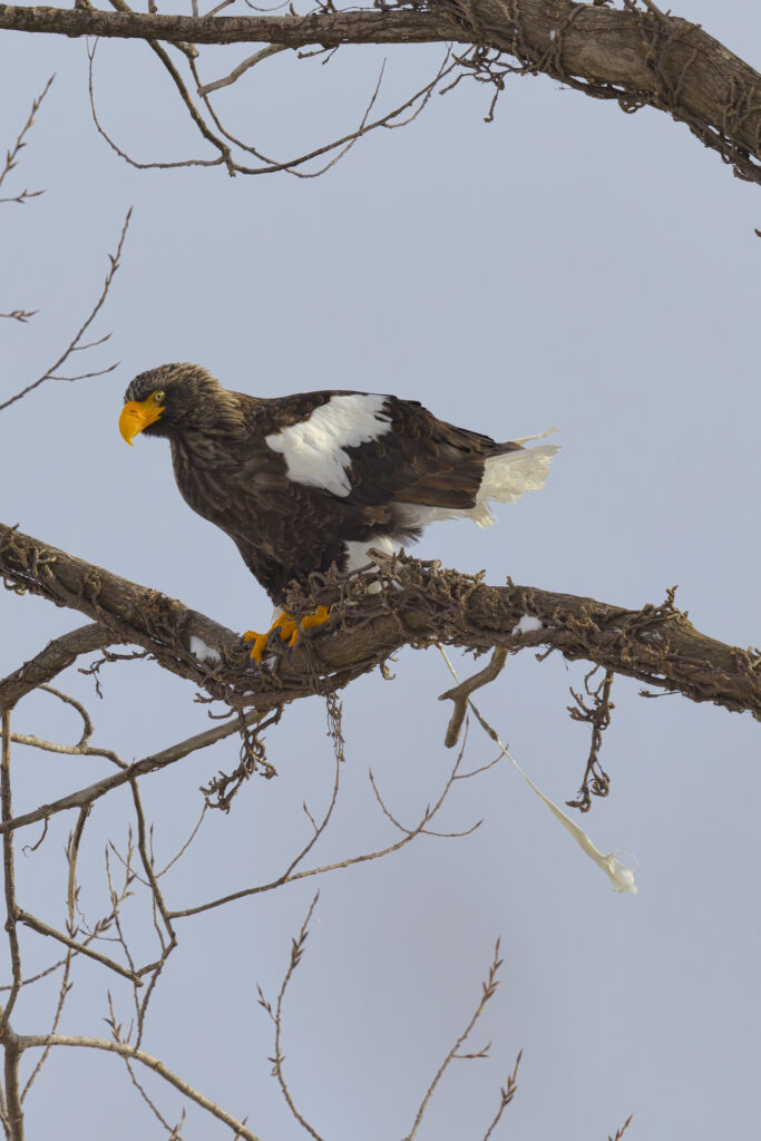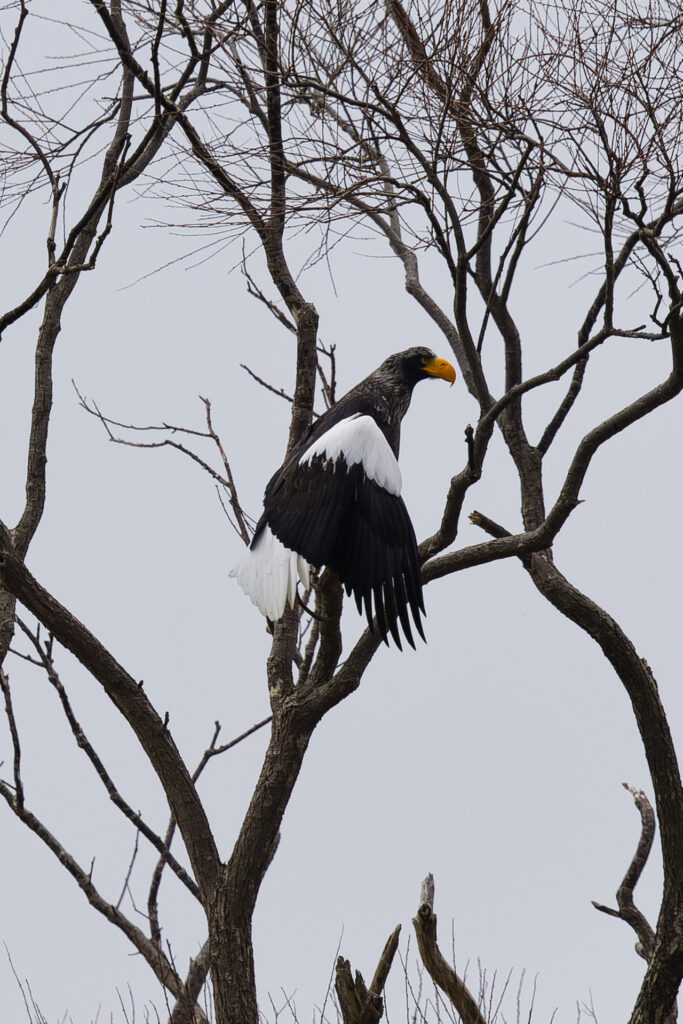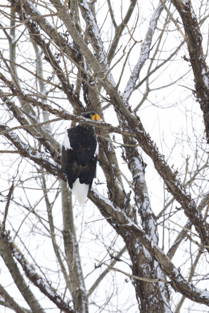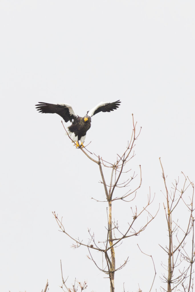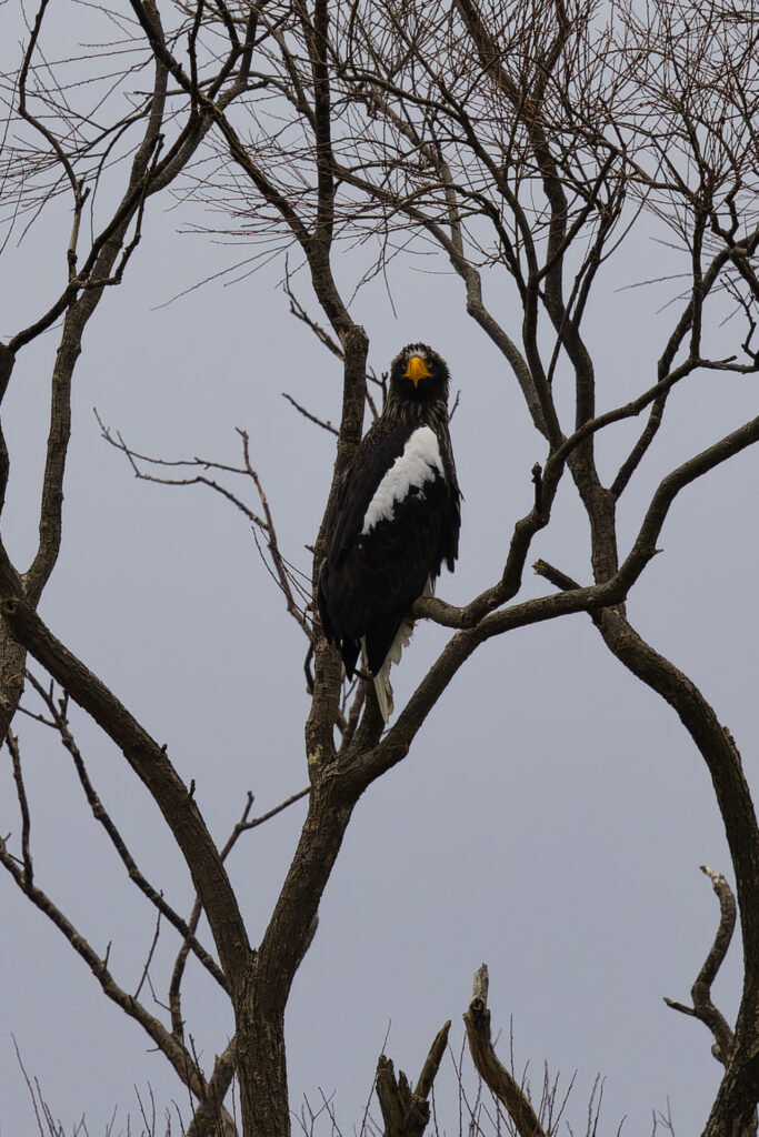 木にとまるオオワシを見つけました。オオワシごとにお気に入りの木があるのか、冬季は海岸の至る所で猛禽類が木にとまっているのを見かけます。