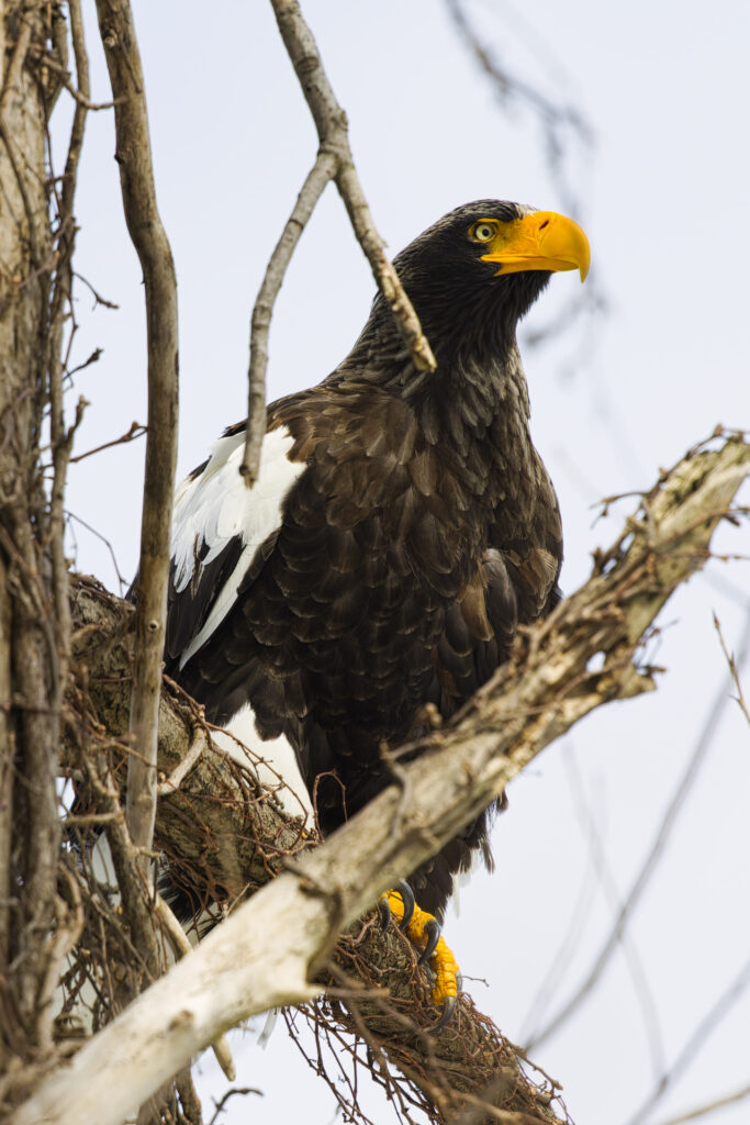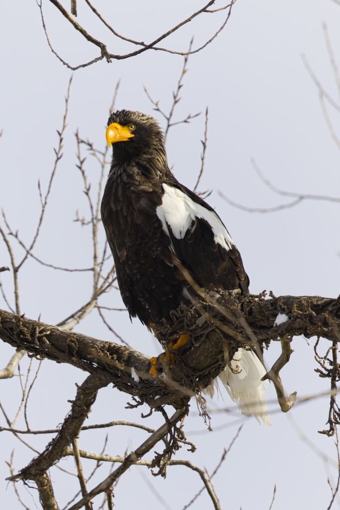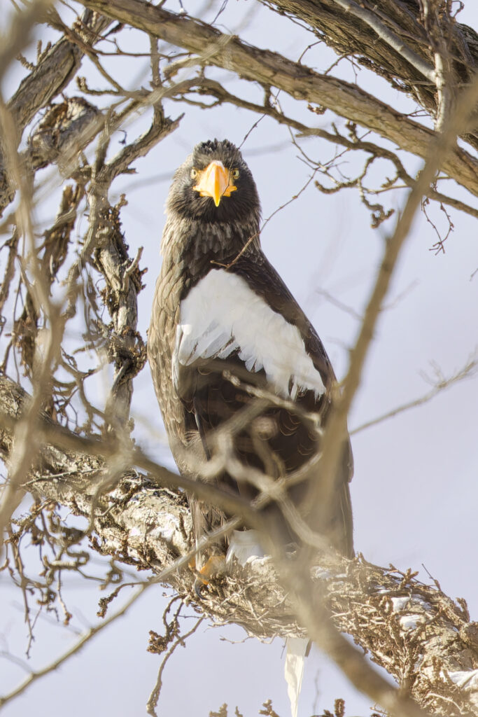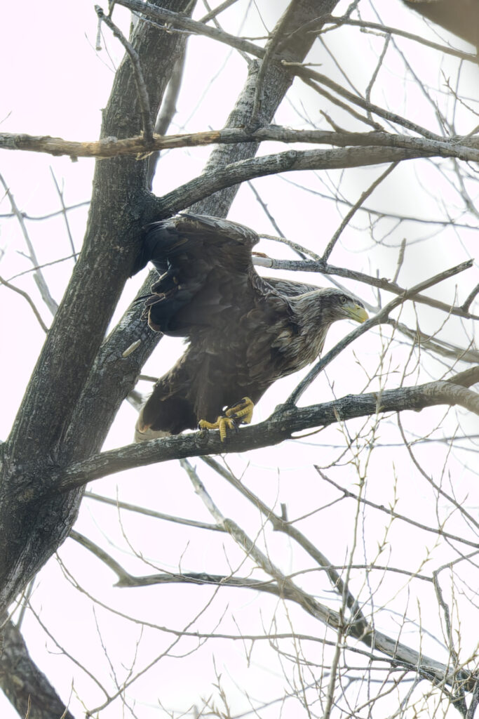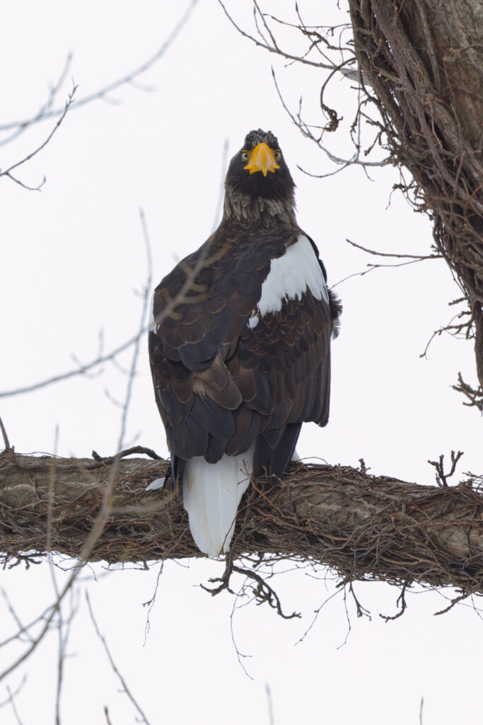 木にとまるオオワシを見つけました。オオワシごとにお気に入りの木があるのか、冬季は海岸の至る所で猛禽類が木にとまっているのを見かけます。