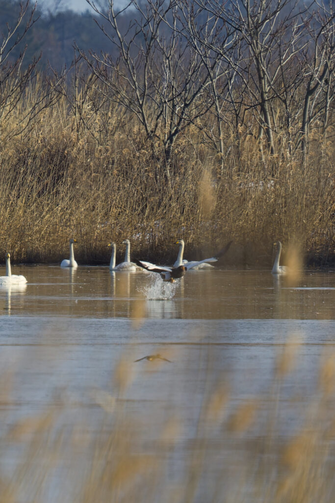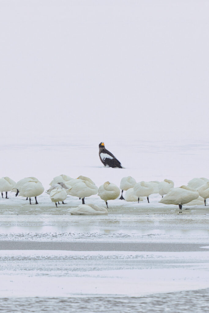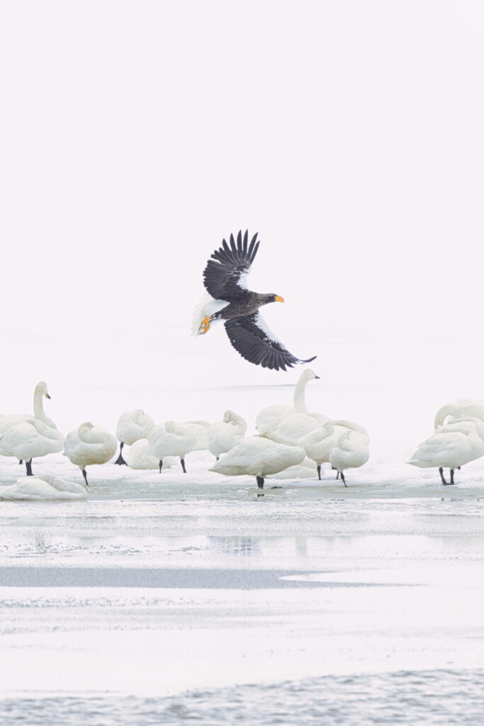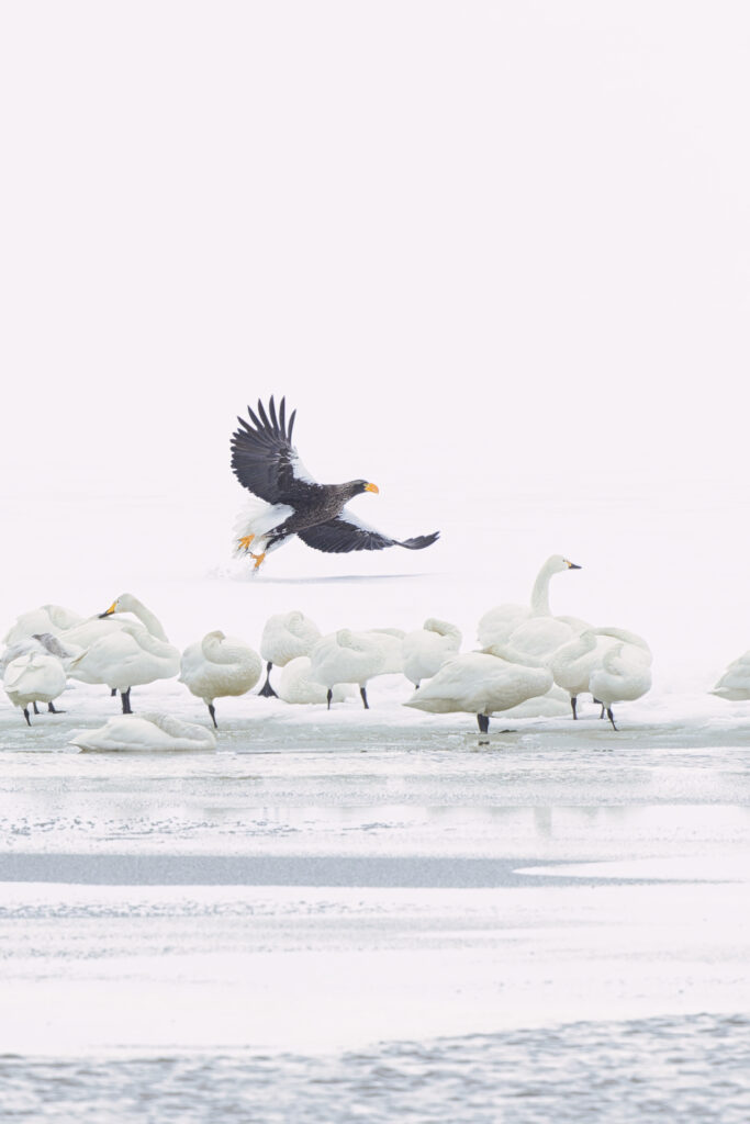 手前にハクチョウの群れがいるので、AFを下側にあてると、手前にピントが持っていかれます。そのため、オオワシのちょい上の空間を領域拡大AFや1点AFであわせることで、オオワシにピントが合います。