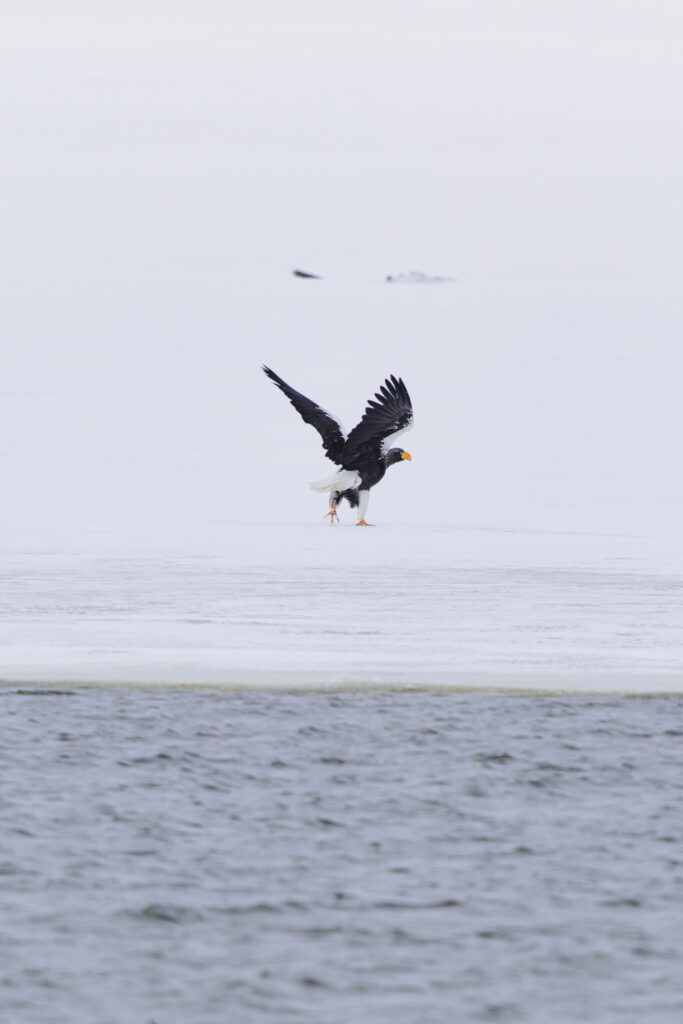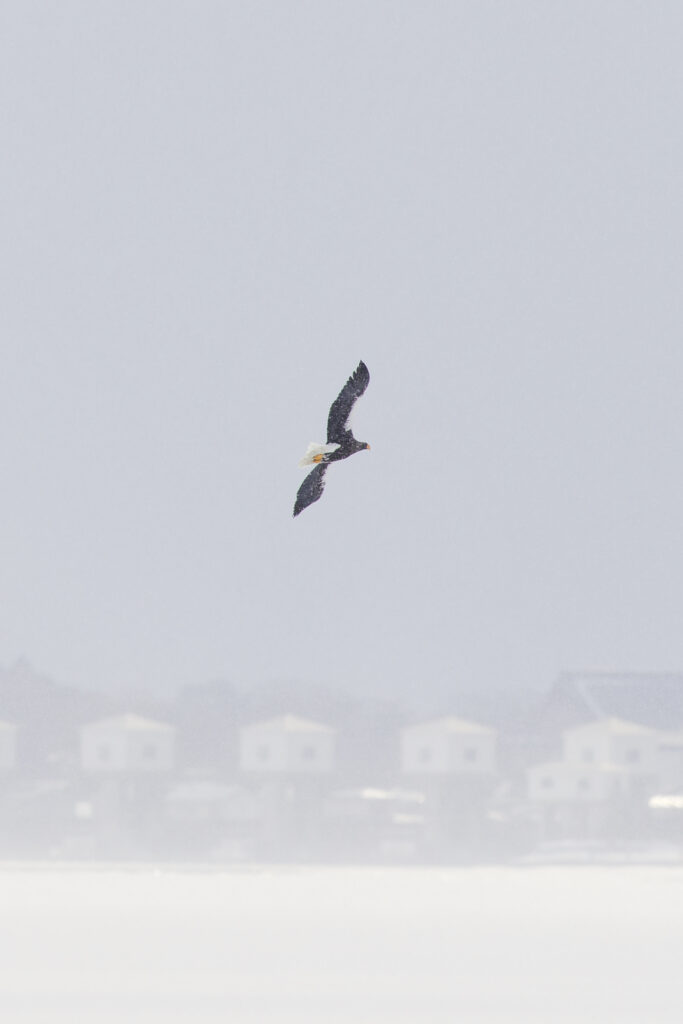 吹雪の中、氷上から飛び立ったオオワシが白い景色の中に消えていきました。