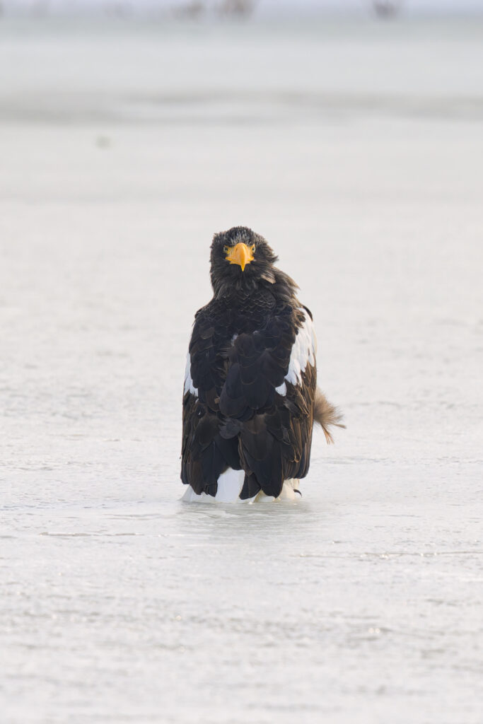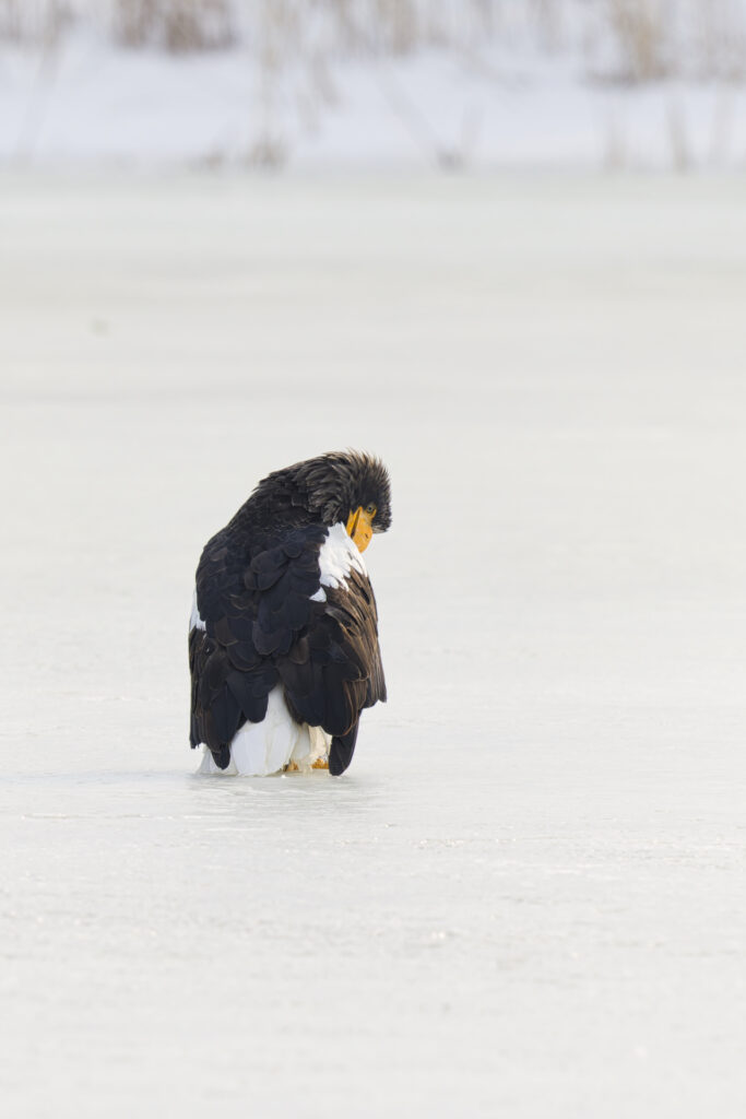 晴れた日、氷上にオオワシがぽつんと降り立っていました。