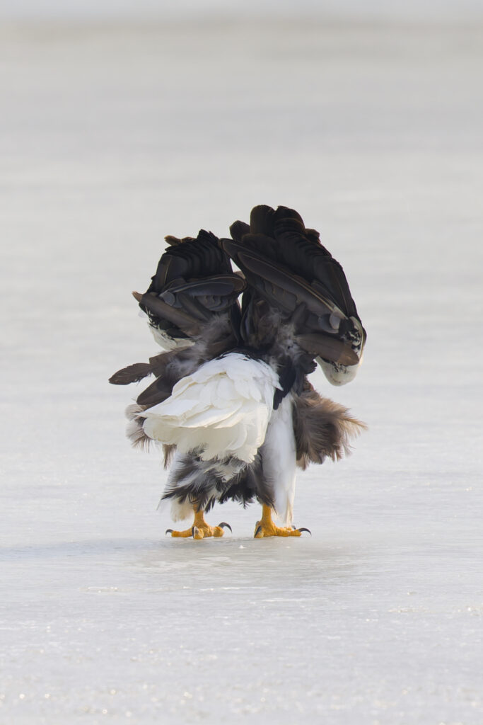 氷上のオオワシが翼を高くあげて、歩いて奥へ行ってしまいました。