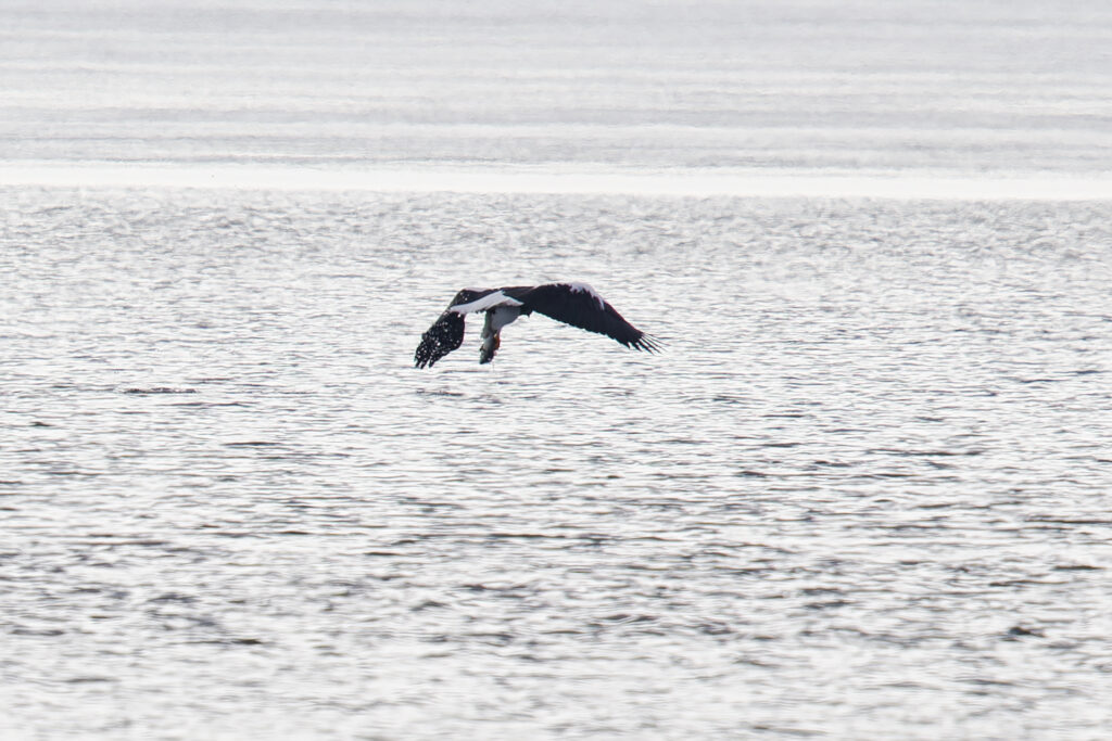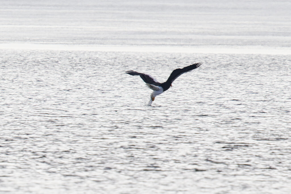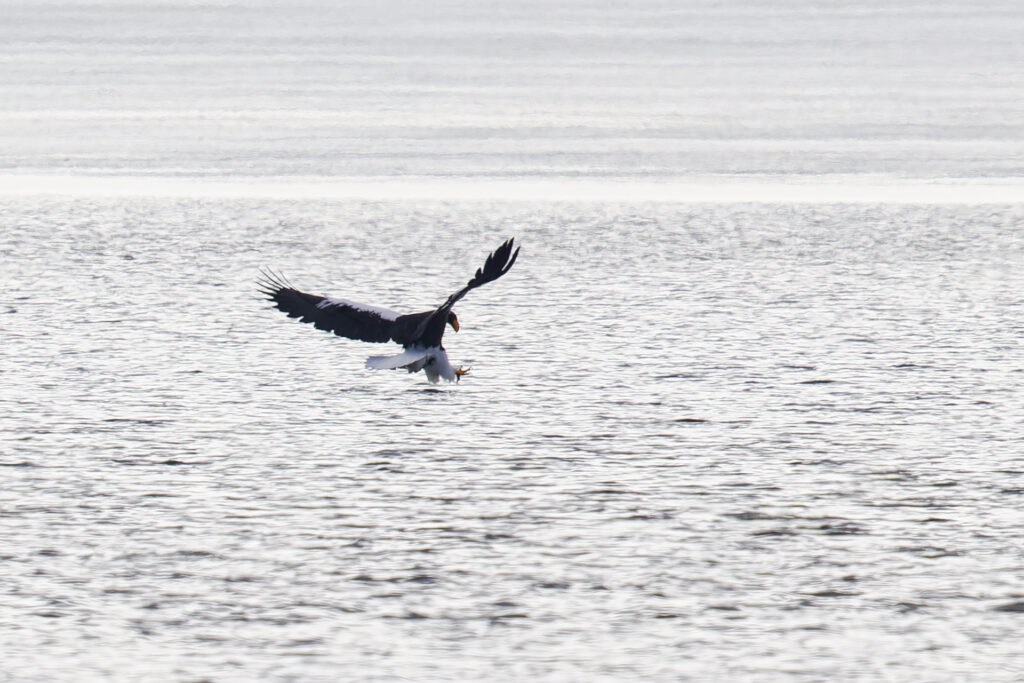 上空を旋回していたオオワシが鋭角に水に向かって降下し始めて、魚を狩ってました。飛び込む場所が分からないので運要素が大きいです。