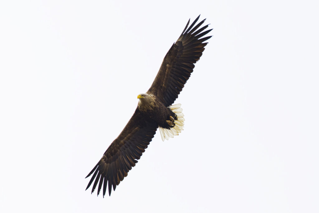 オジロワシの亜成鳥が空中で身を翻してこちらを向いた瞬間を狙って撮影しました。